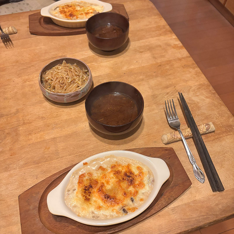 マカロニグラタンの夕食。基本、牛乳は飲まないんだけどたまには。