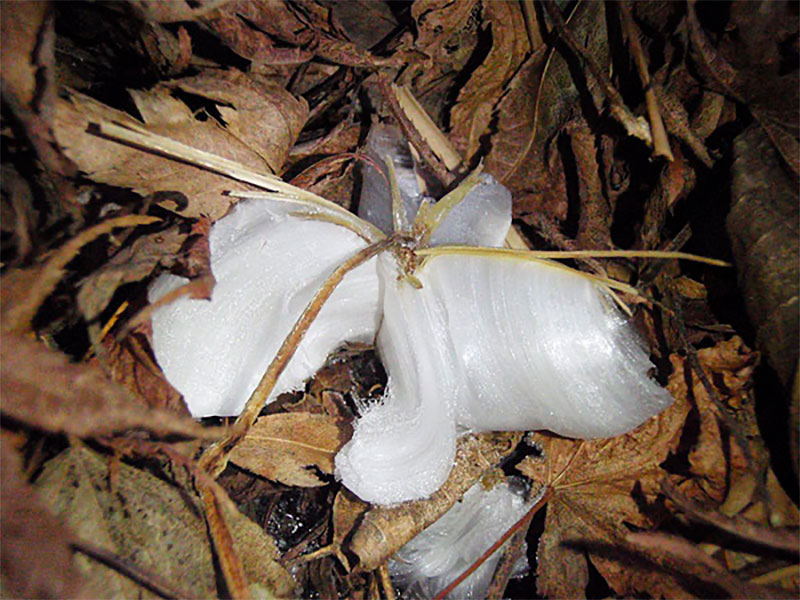 シモバシラ:冬に高尾山の山頂付近のシソ科のシモバシラという植物が地中から吸い上げた水が枯れた茎から染み出して花の様に凍る「シモバシラ」。数日前の冷えた朝に山頂ではなく実家の庭のペンタスの枯れた枝に出来たって母親が家族ラインでシェアしてくれた。すごい!すごい!