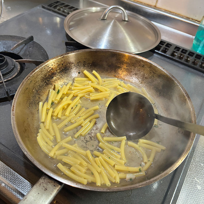 マカロニ茹でて旨み地獄のスープでいただきます。