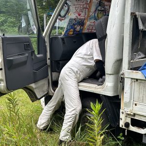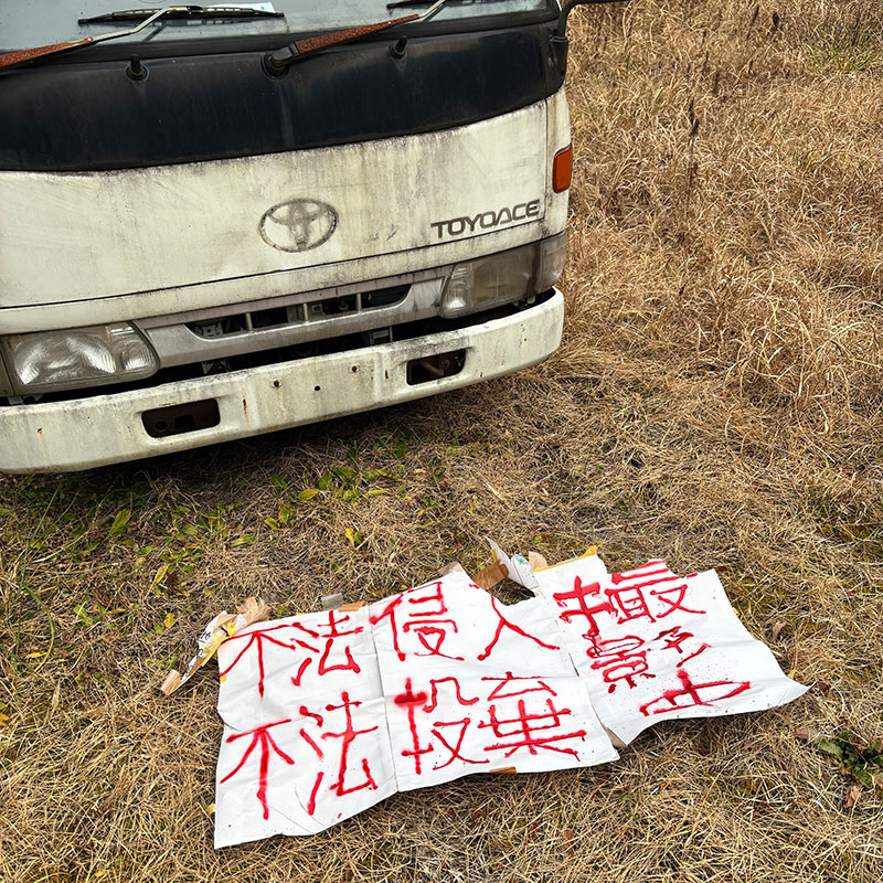 仕事場に不在の時に不法侵入やゴミ捨てが酷かったので国道からよく見えるこのトラックのフロントガラスに「不法侵入 不法投棄 撮影中」(撮ってないけど・笑)と大きな紙に書いて貼ったらピタリと止んだこと。