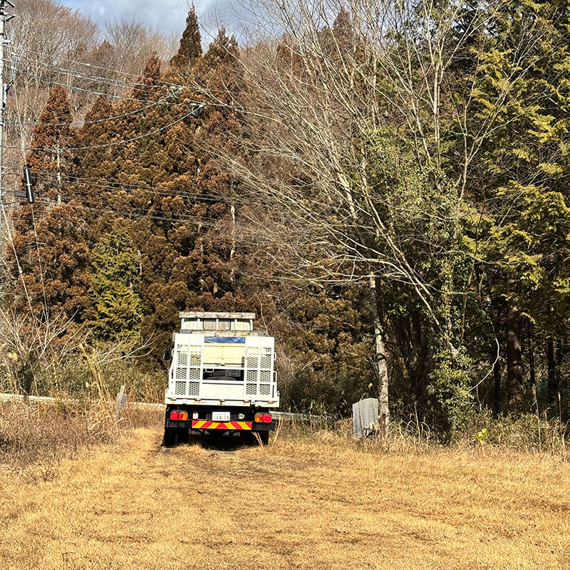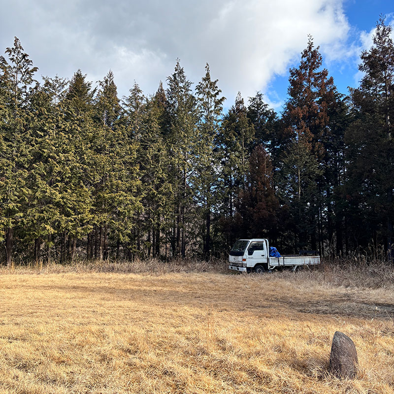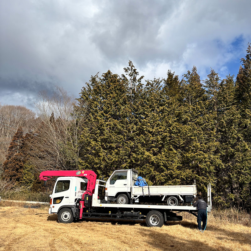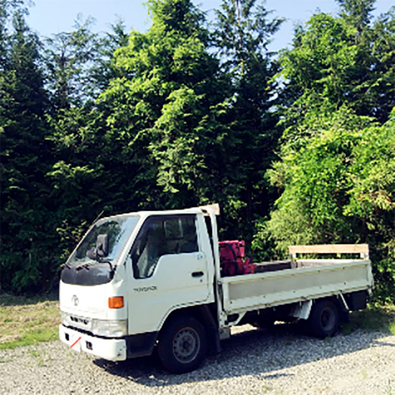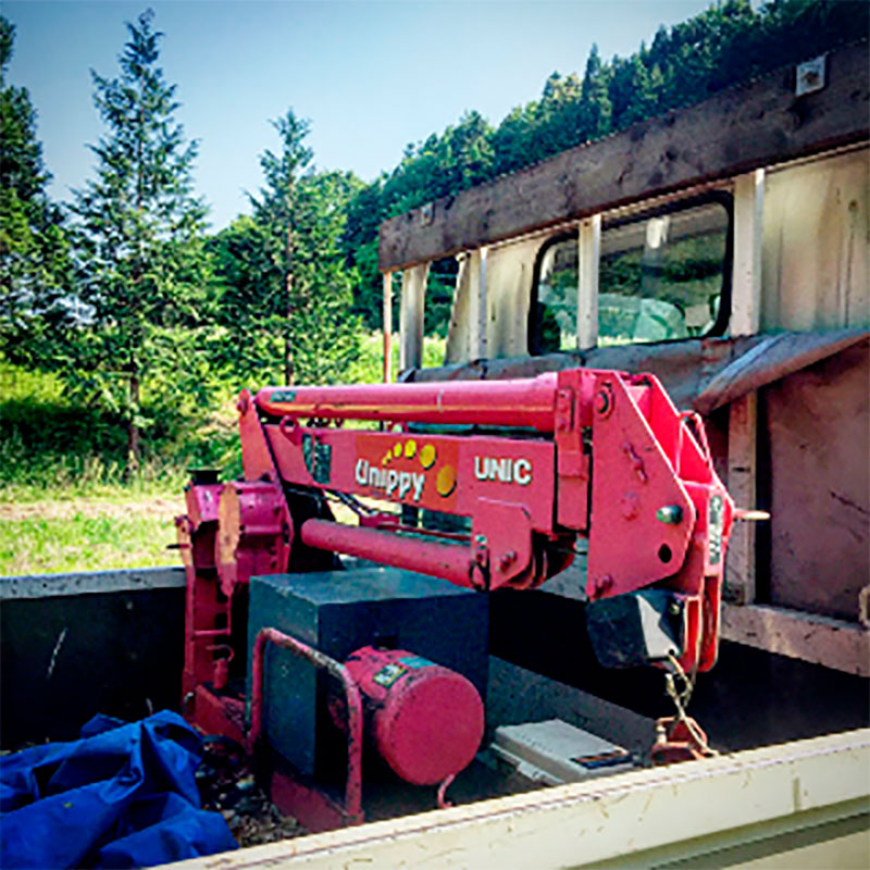 8年前の夏に友だちが廃車にするユニック車を仕事場で石を吊るのに使えるだろうと埼玉から乗って持ってきてくれた車。