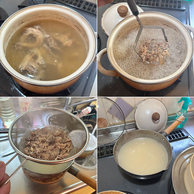 スーパーで鶏ガラ見つけたのでじっくり長時間、弱火で炊いた後極強火にして仕込んだ鶏白湯スープ。