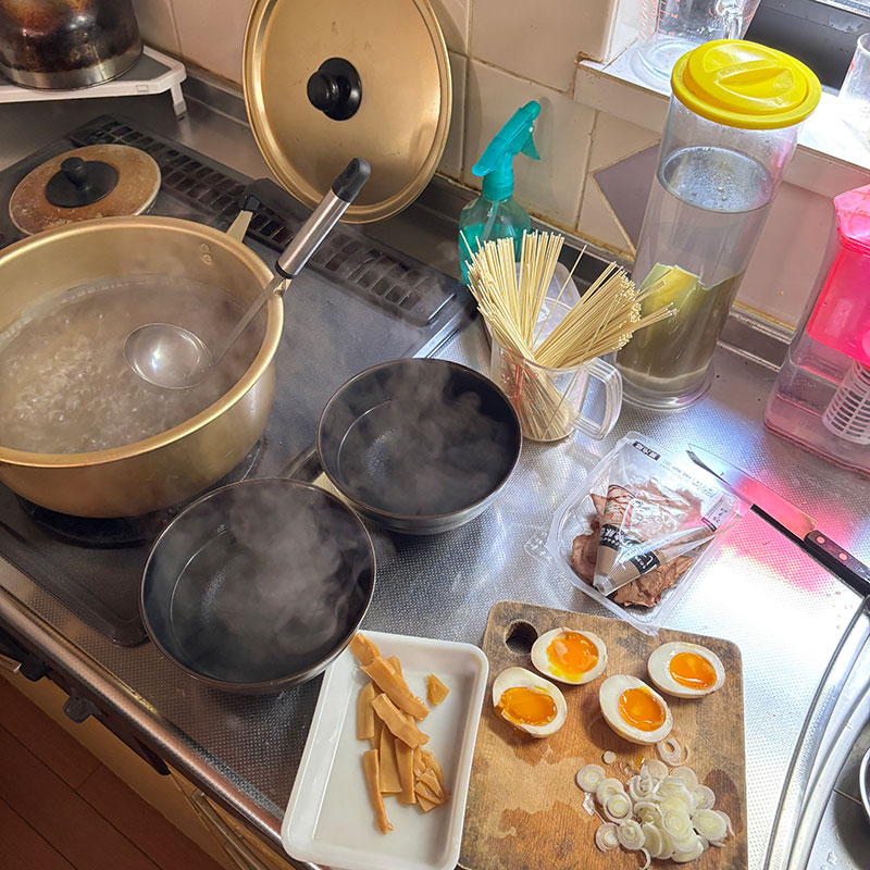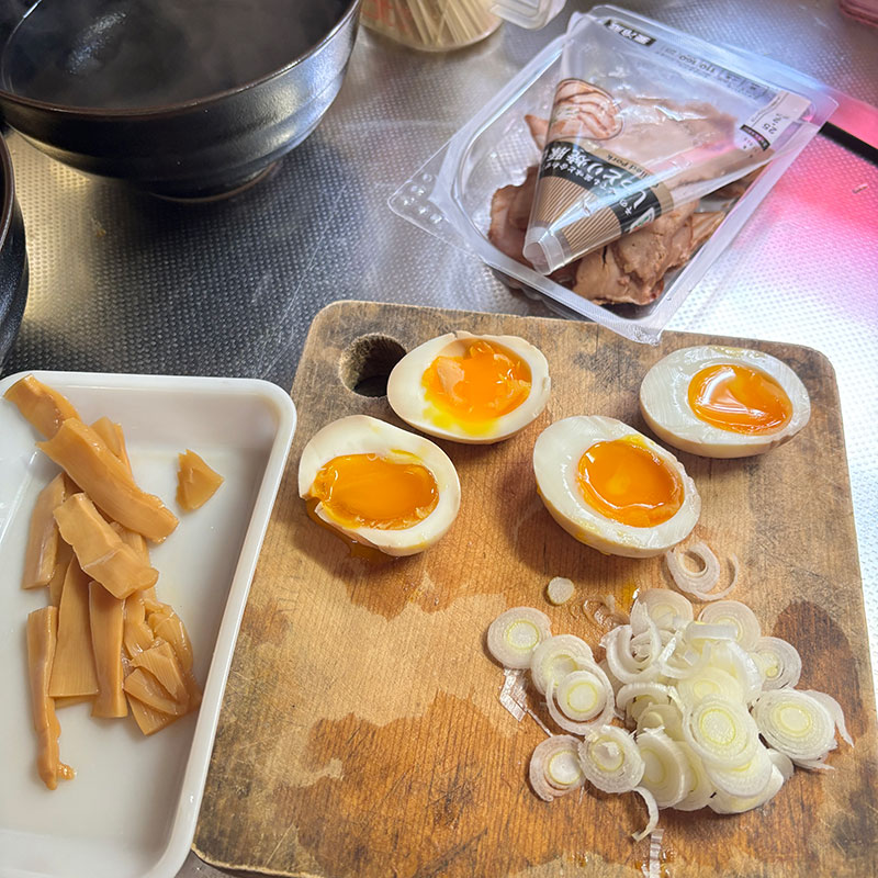 昨日から半熟の味付け卵は仕込んでおいた。