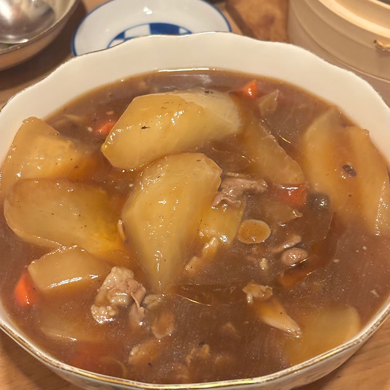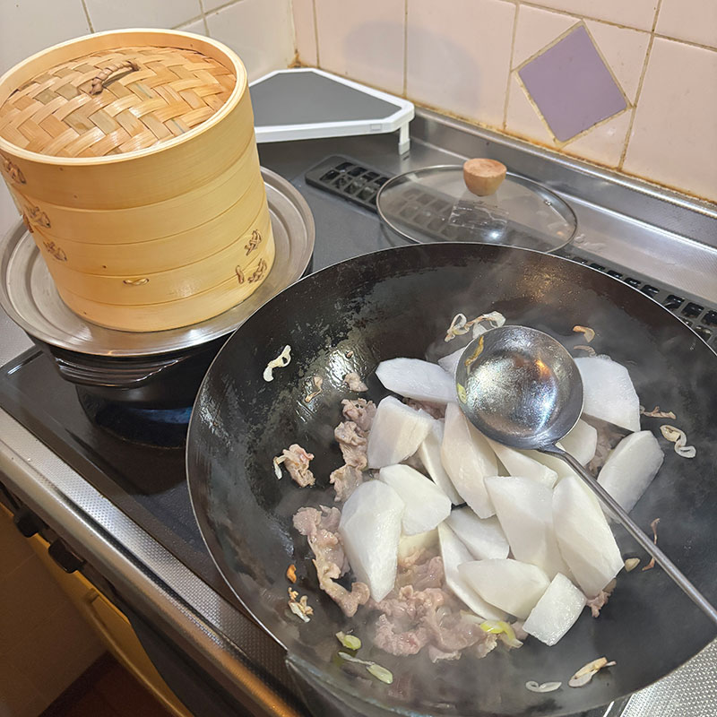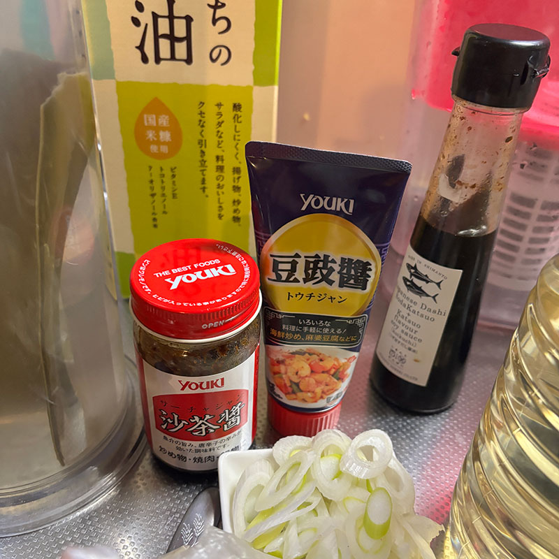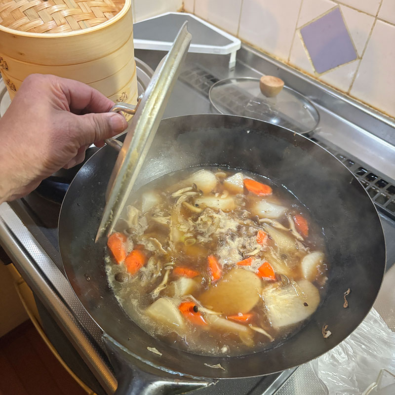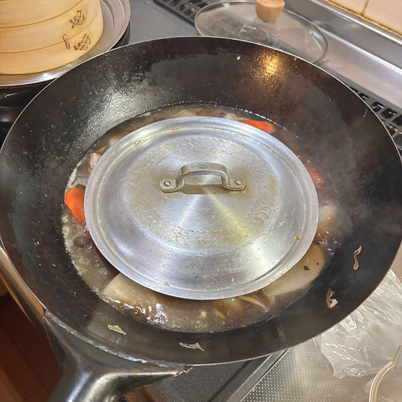 スープと醤油で炊いていく。水は昆布水。隠し味に豆豉醬と沙茶醤。