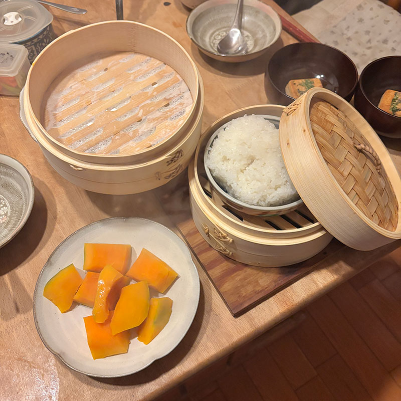 冷凍ご飯は蒸篭で温める。