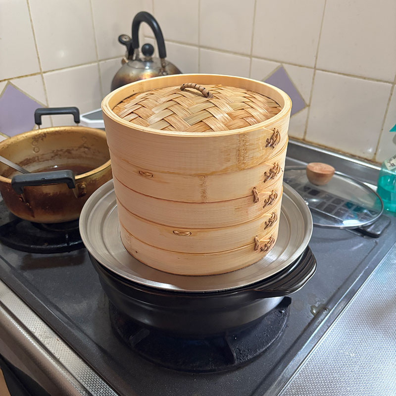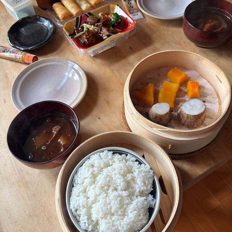 今日の蒸籠蒸し。冷やご飯とかぼちゃと里芋。かぼちゃを一番美味しく食べられる調理法がただ蒸すだけ、かもしれない。