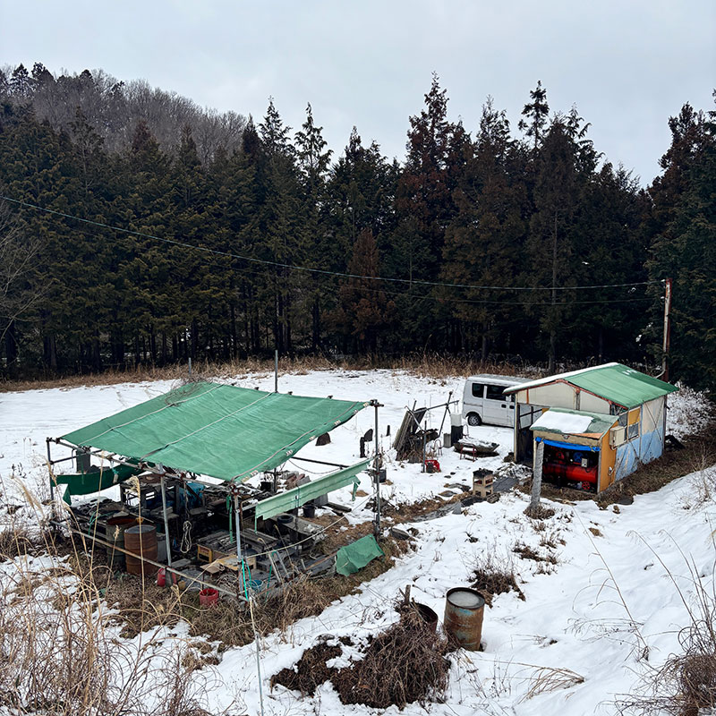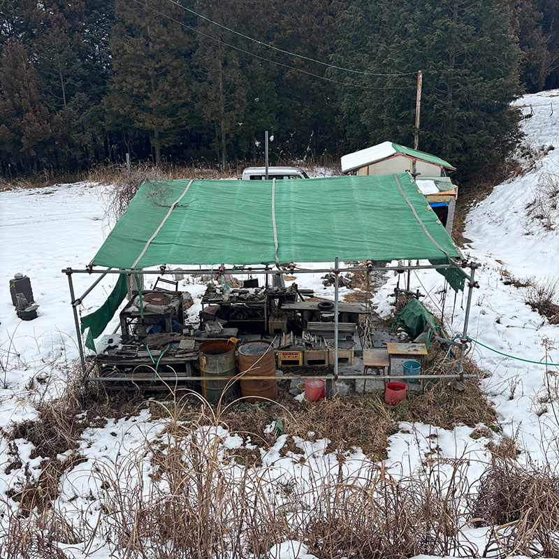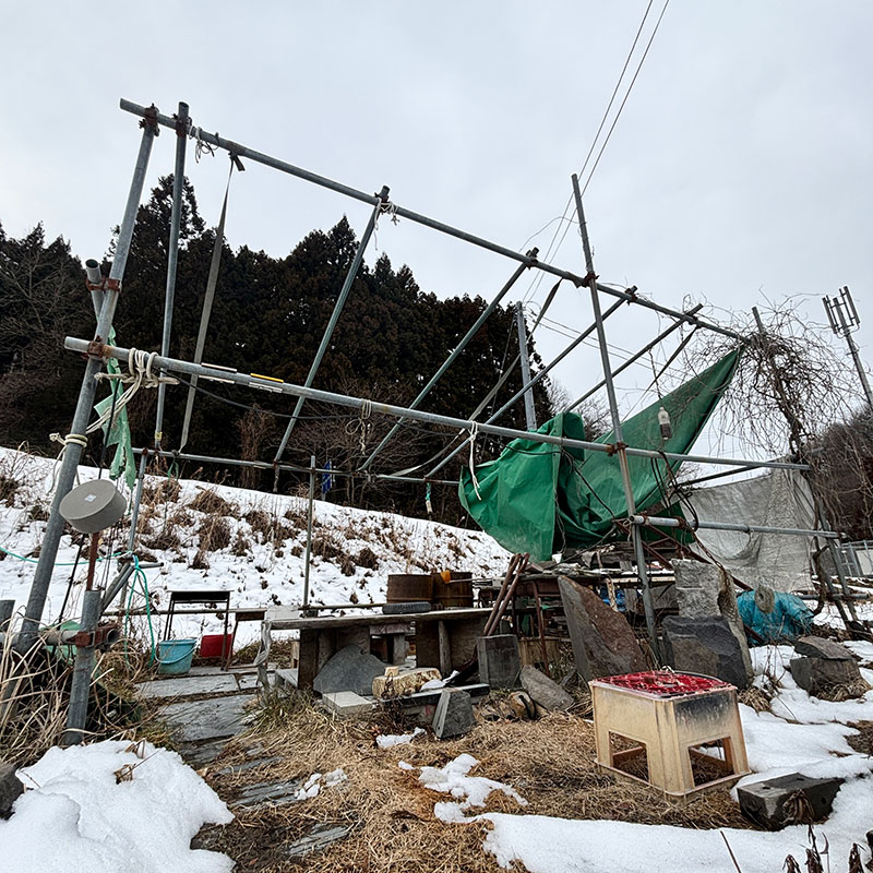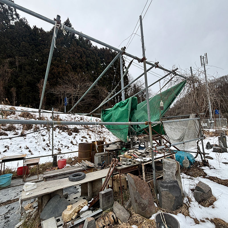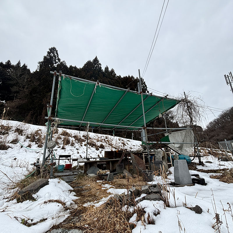 先日、暴風で飛ばされて張り直したばかりの仕事場のテント。また強風でやられた。