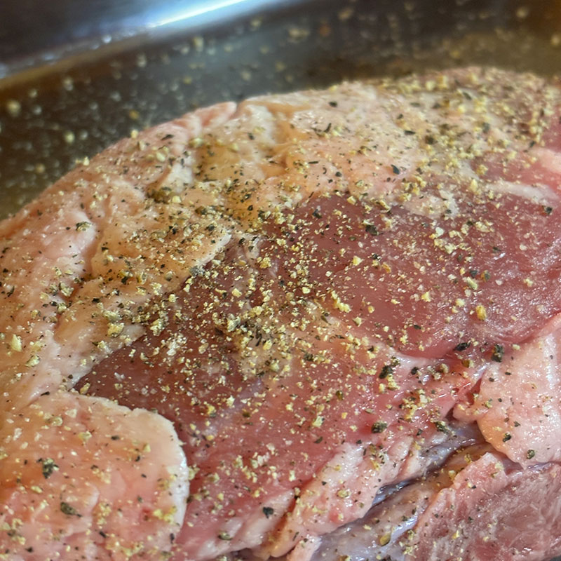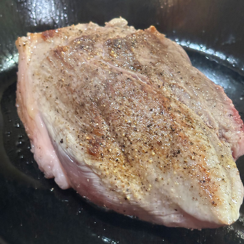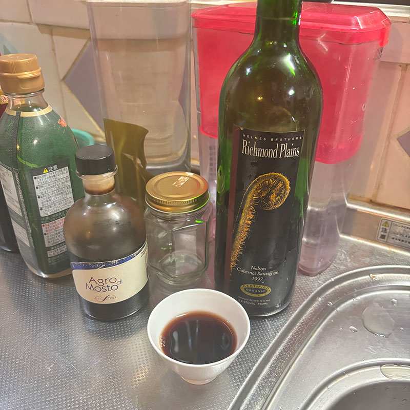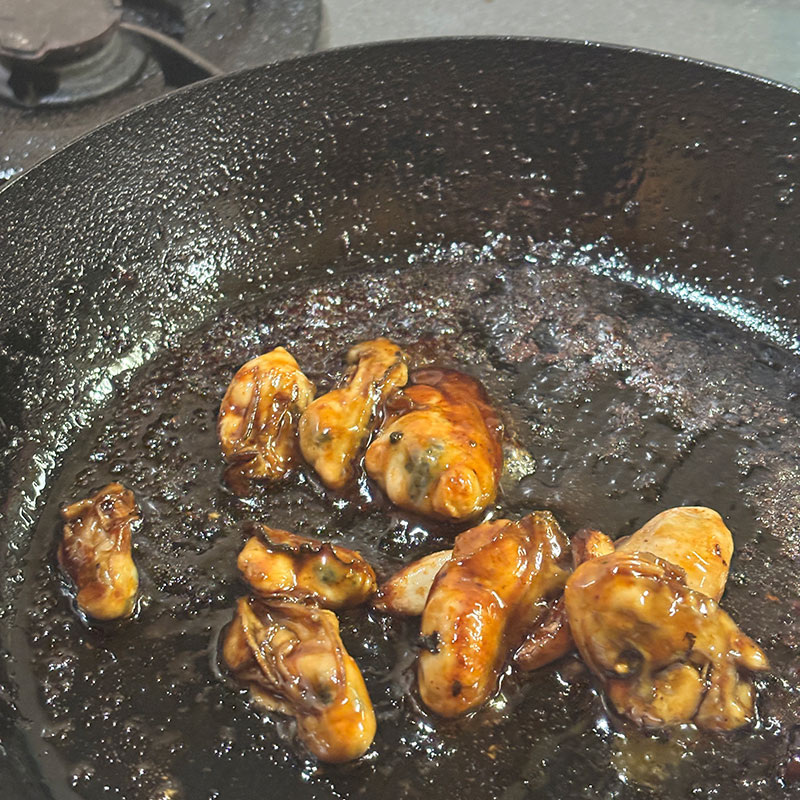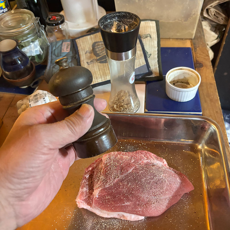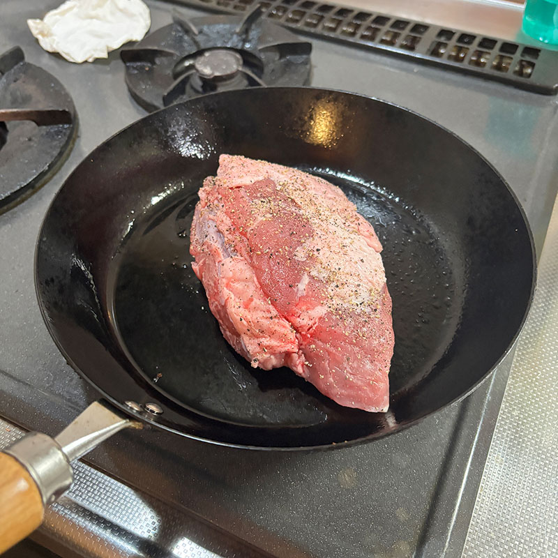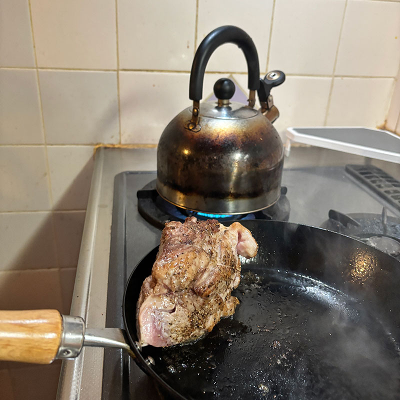 醤油、酒、みりんを塩胡椒した豚ももブロックの外側をソテーしたフライパンで合わせてソースにして煮た。