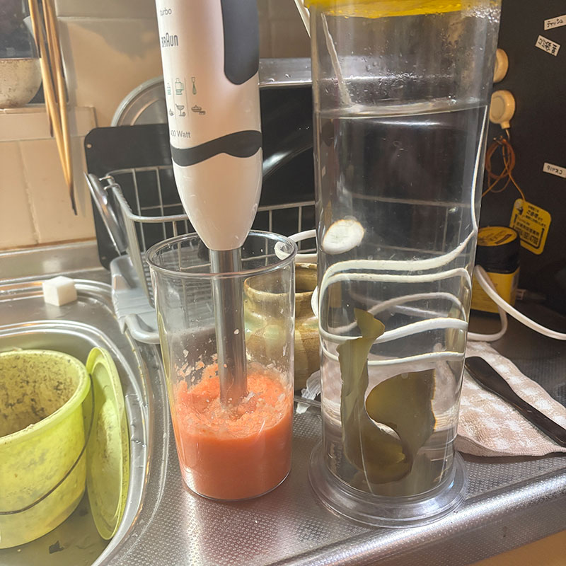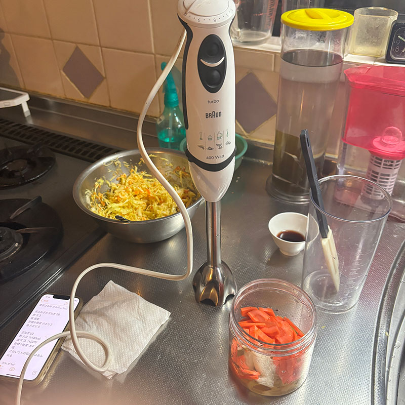 それに米油、リンゴ酢、ゲランドの塩をハンドブレンダーにかけて
