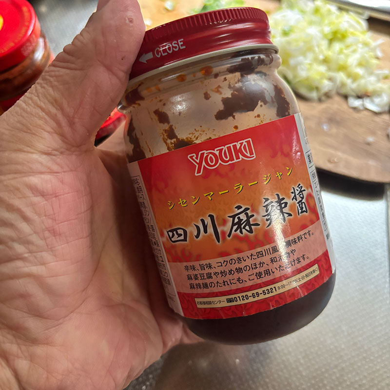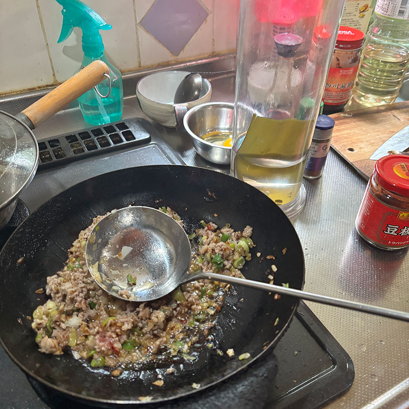 ひき肉が焦げる寸前まで豆板醤と一緒に炒めるのが美味しさの秘訣。中華には必ず豆豉醬を少し使う。