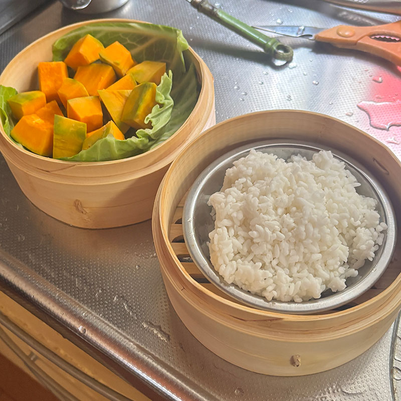 今日の蒸籠蒸し。冷凍ご飯とかぼちゃ。