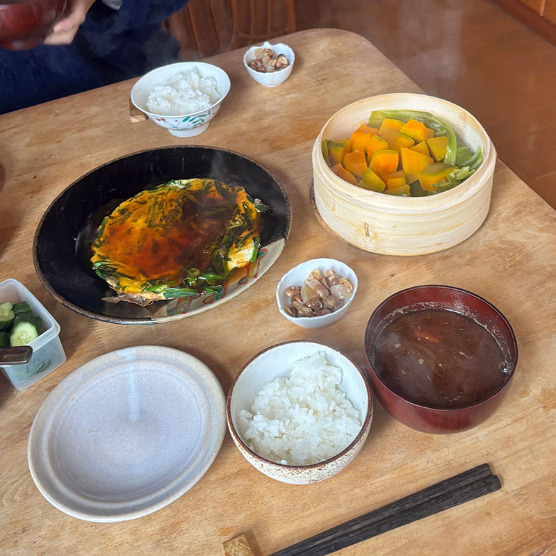 昨日のもつ鍋に使いきれなかったニラで餡かけにら卵。根菜の味噌汁。八丁味噌と麹味噌合わせて。