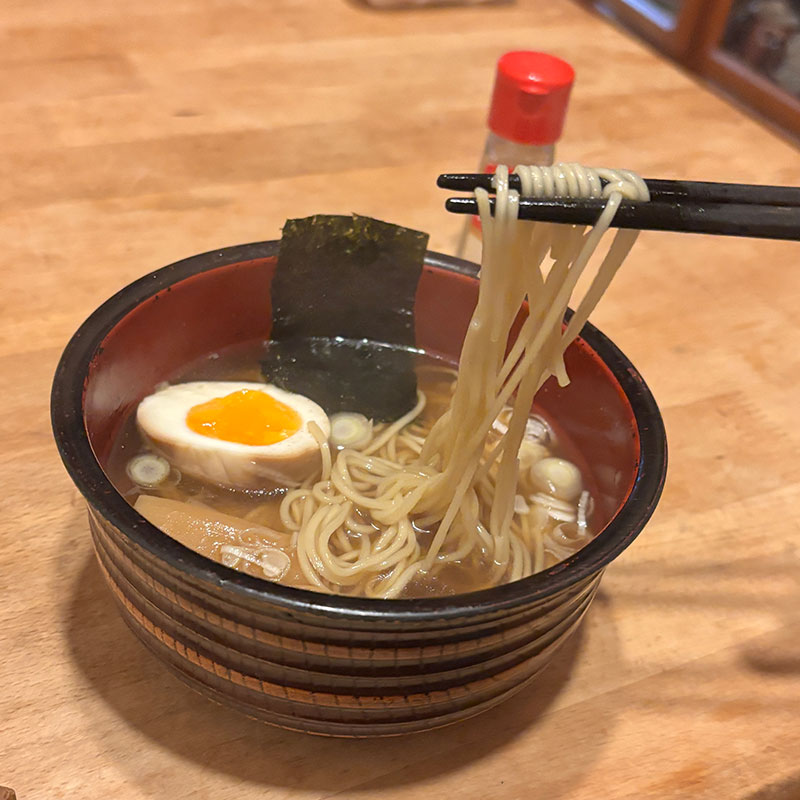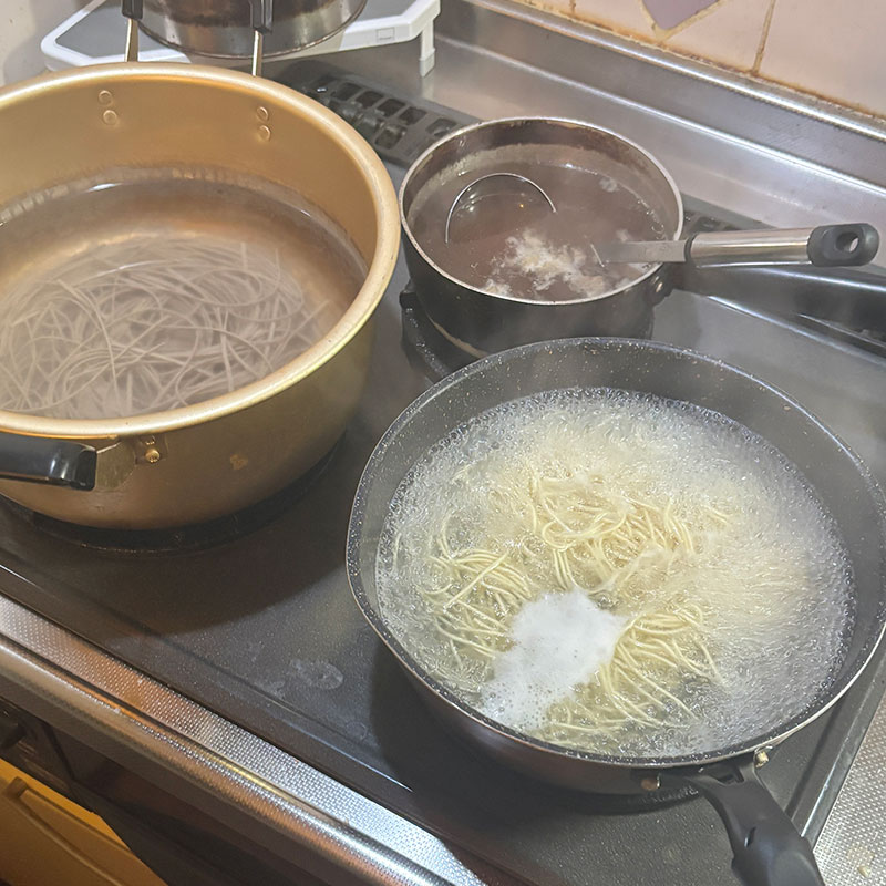 僕はマルタイの棒ラーメン、カミさんは蕎麦をそれぞれ茹でた。