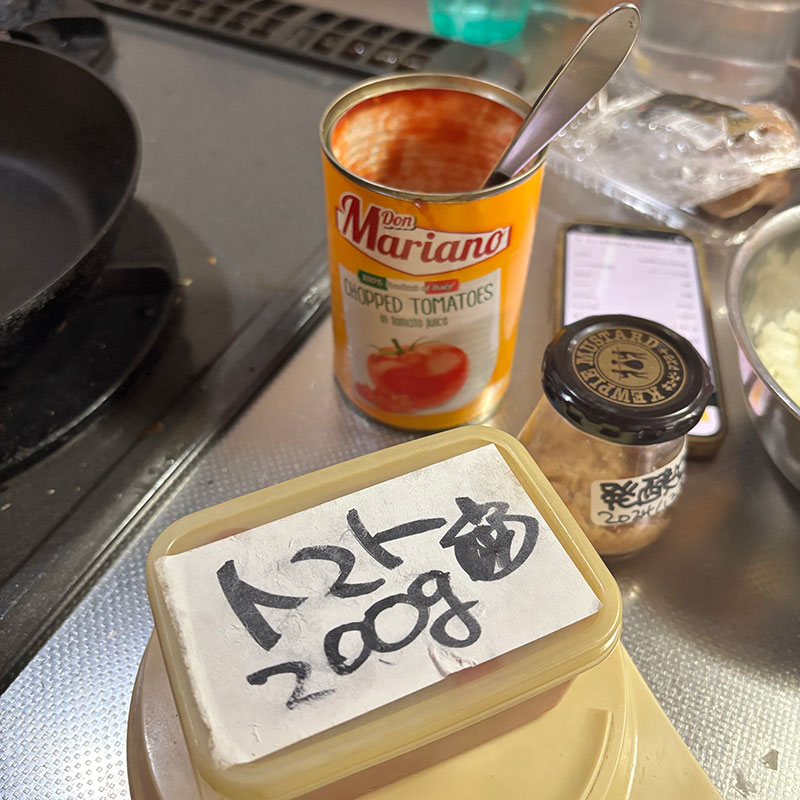 一回に使うトマト缶は半分なので専用の冷凍タッパー用意してある。