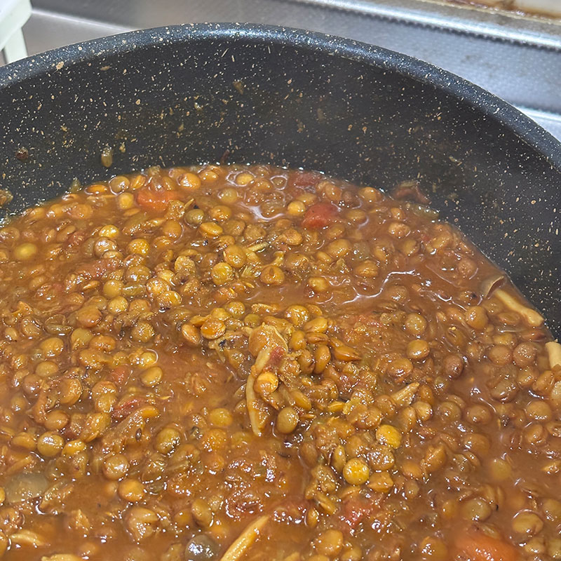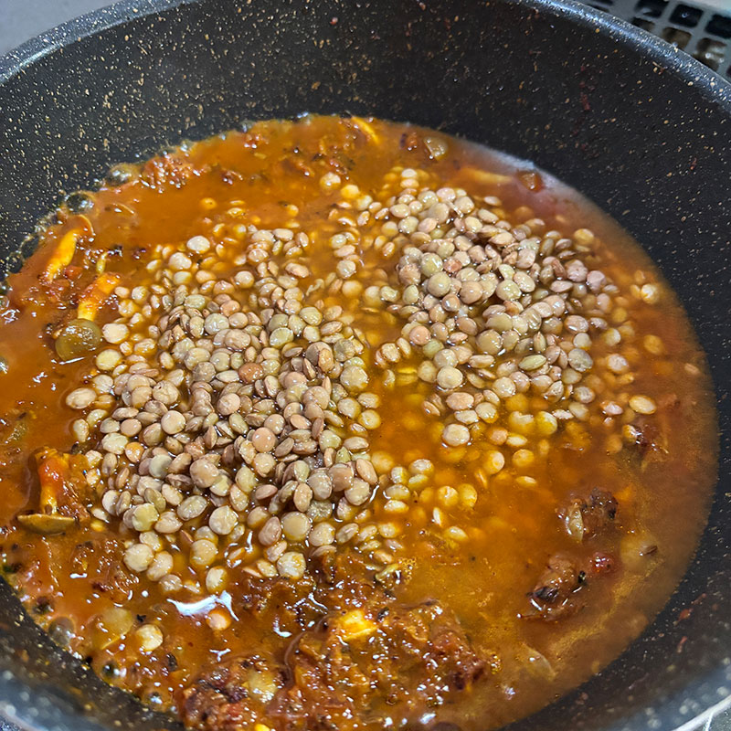 水に浸けておいたレンズ豆加えて
