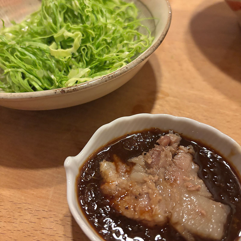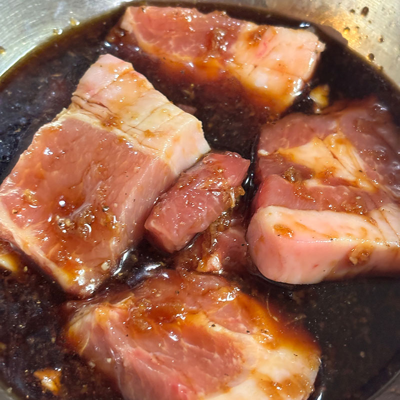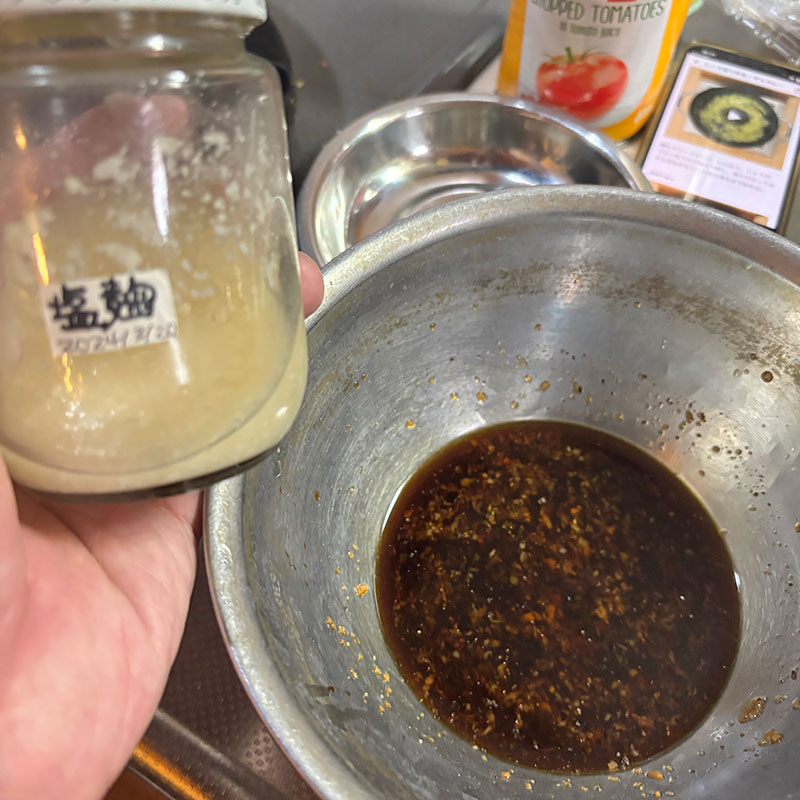 発酵生姜を使った調味液にスジを切った豚肩ロースを漬け込む。自家製塩麹も少し。
