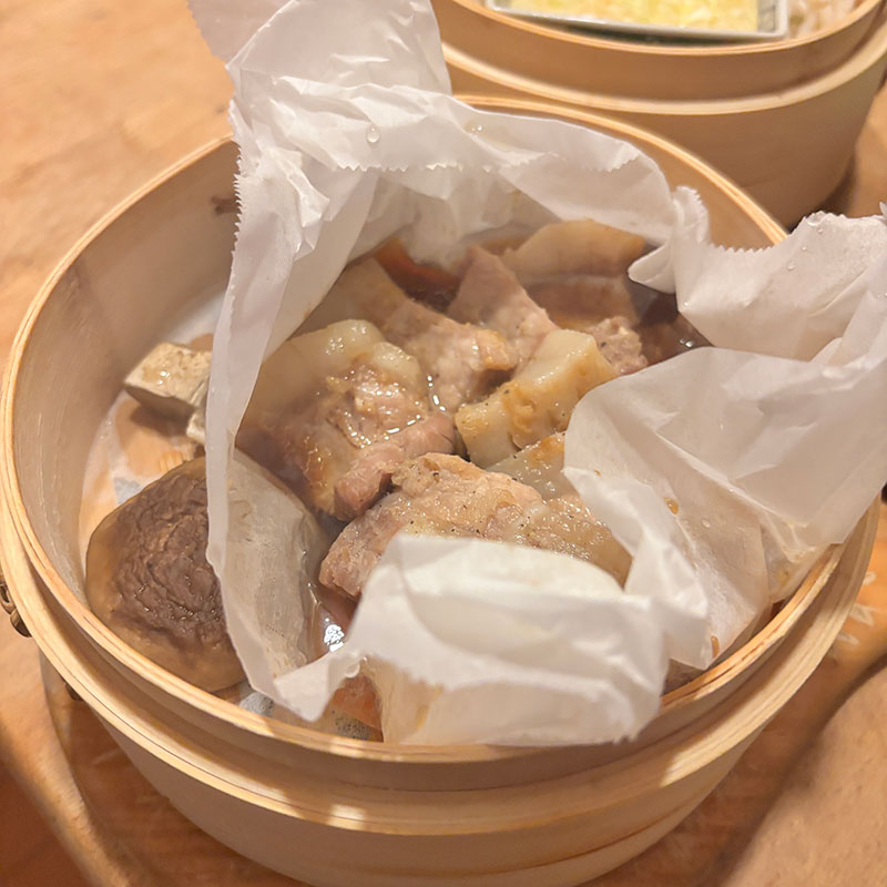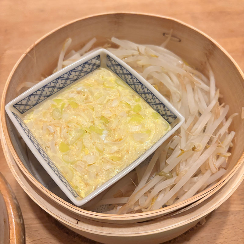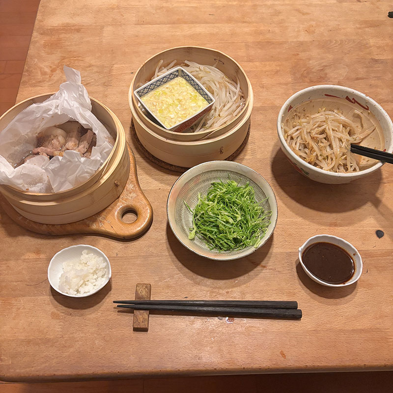 蒸したもやしや千切りキャベツと。なんでも美味しくしてくれる蒸籠蒸し、最強!!