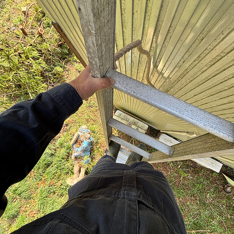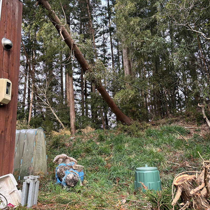暴風で家に倒れた杉の木をこの後、屋根から降ろす。ちょうど下にコンポストがあるので