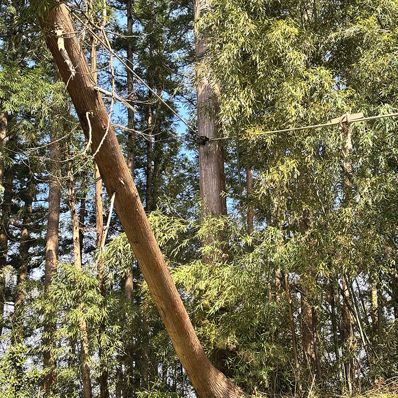 長いハシゴを使って倒れた木の後ろに生えている杉の木の出来るだけ上の方にワイヤーを巻いて滑車を装着。
