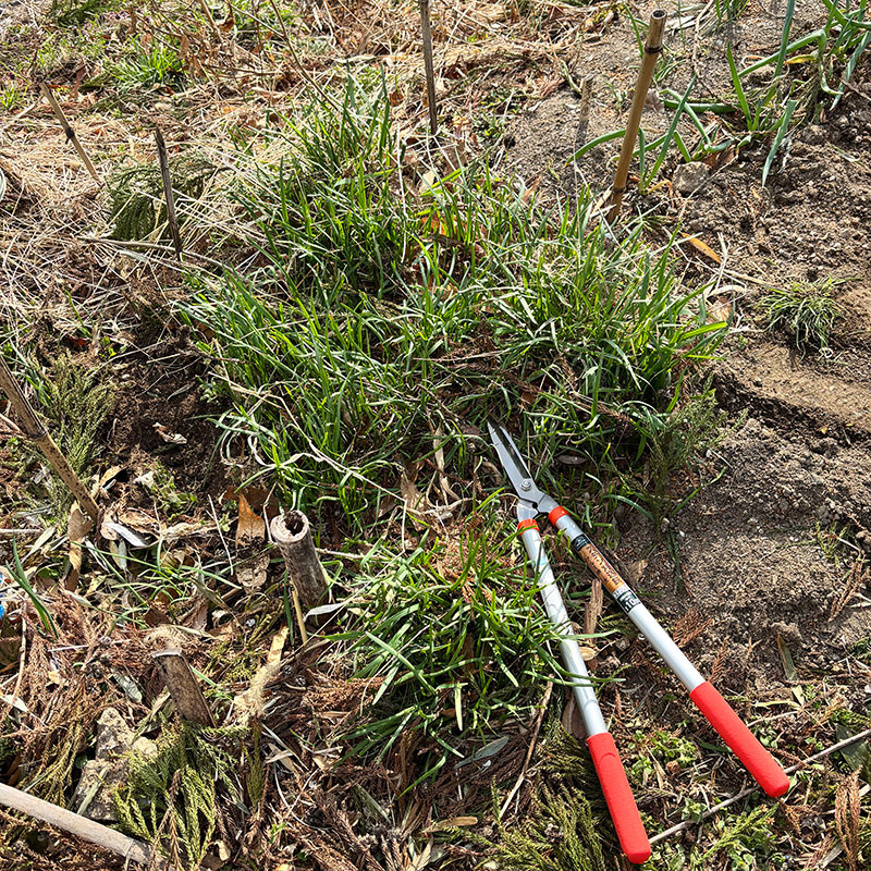 ニラに新しくて柔らかい葉を出してもらいたいので一度草刈りばさみで刈り込んでおく。