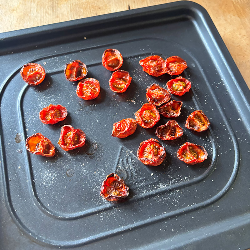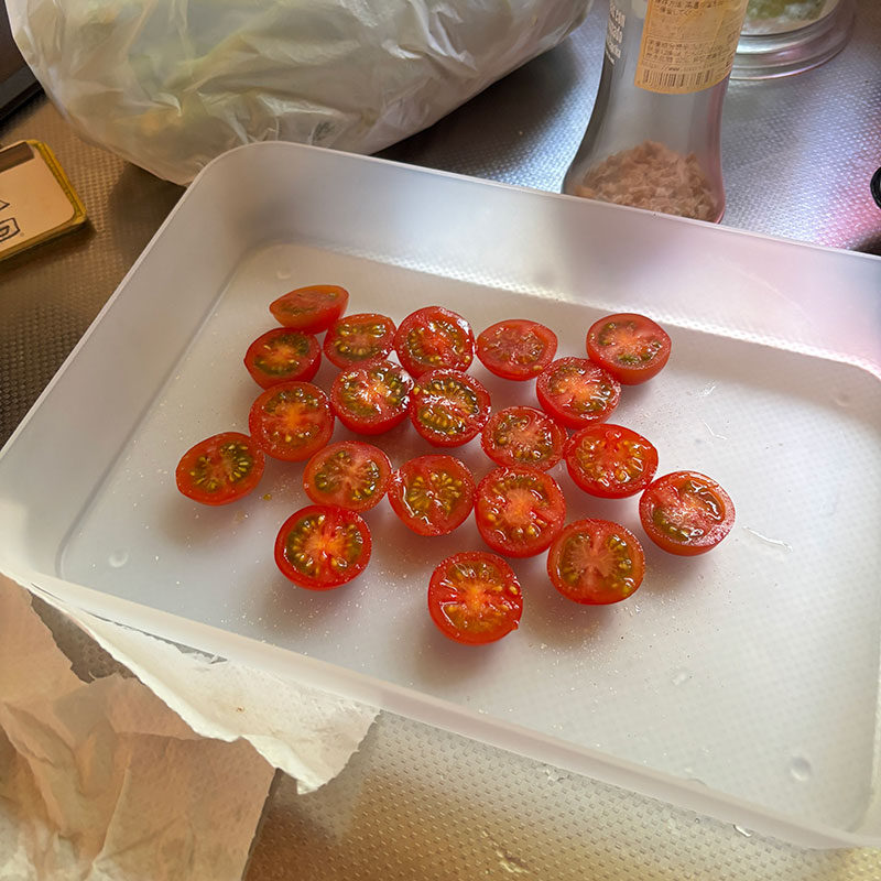 昼に塩したミニトマトを低温で1時間オーブンにかけてセミドライトマトにしておいた。