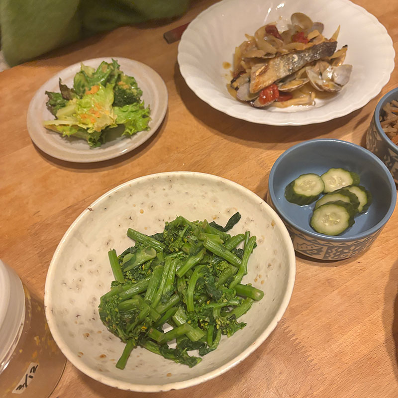これもいただいたアスパラ菜のおひたし。アスパラ菜初めて食べたけど美味しい。きゅうりのぬか漬け。ぬか床に麹を加えたら味も手触りも格段に良くなってる。麹の力ハンパないな。今、冷蔵庫で育ててる麹は塩、醤油、玉ねぎ、レモン。