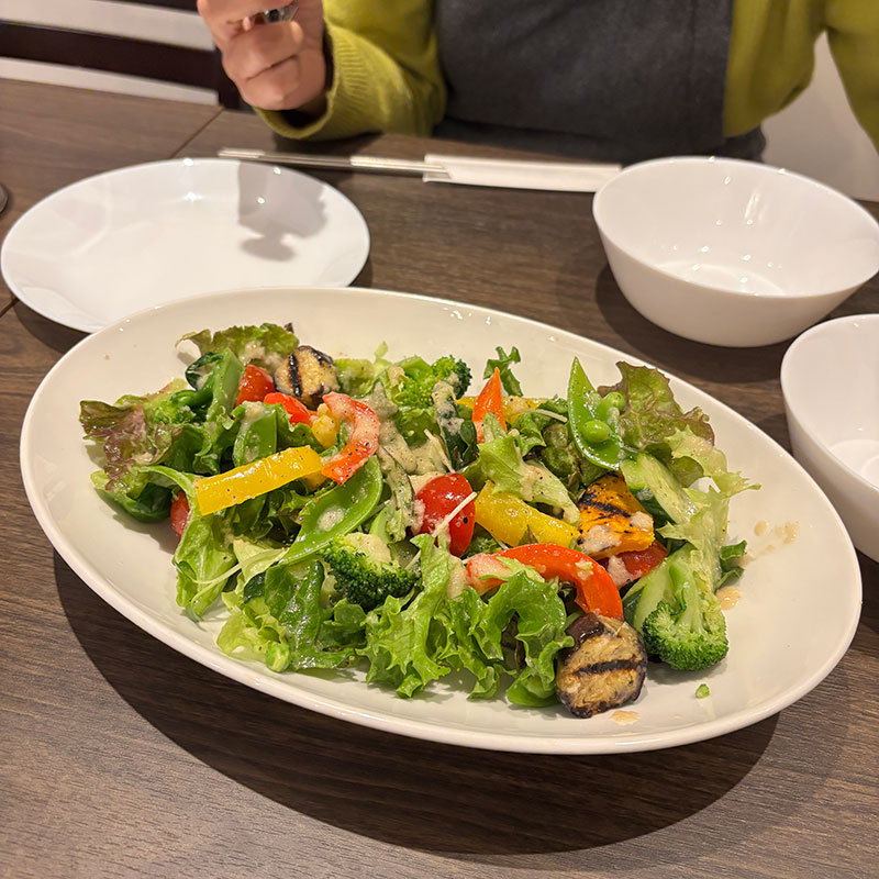 いろいろ野菜のサラダ。グリルされた野菜も入っていて葉っぱと引き立てあってる。