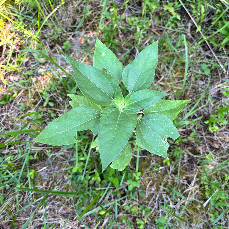仕事場にひまわりを植えて育てている。50cm間隔で12本。