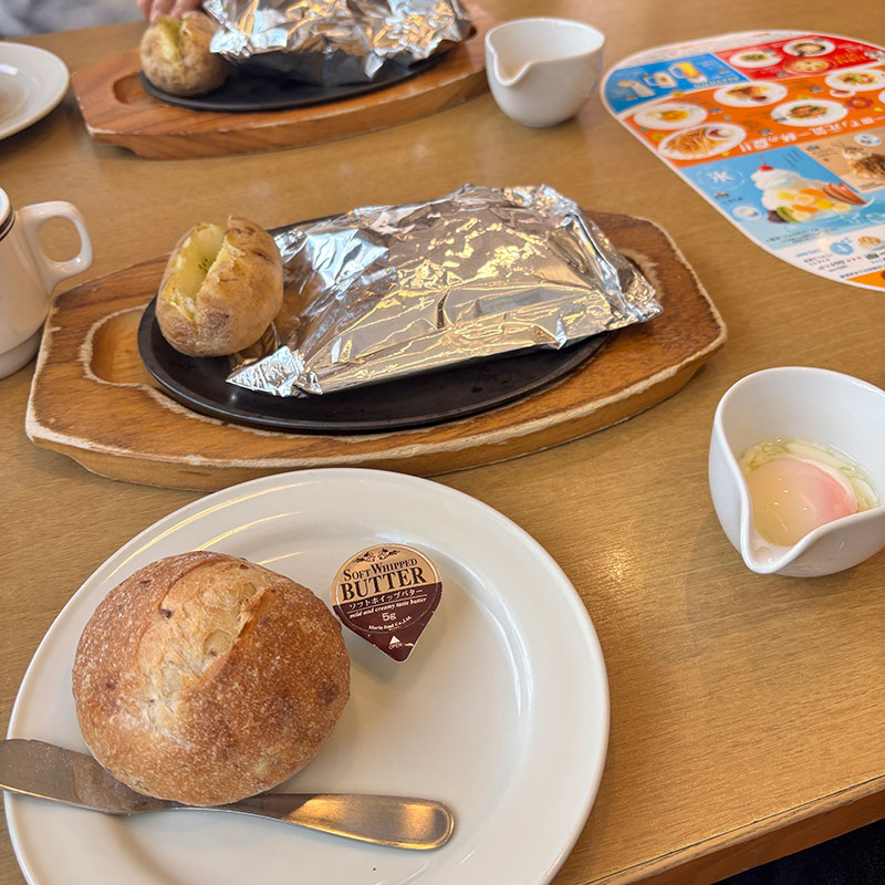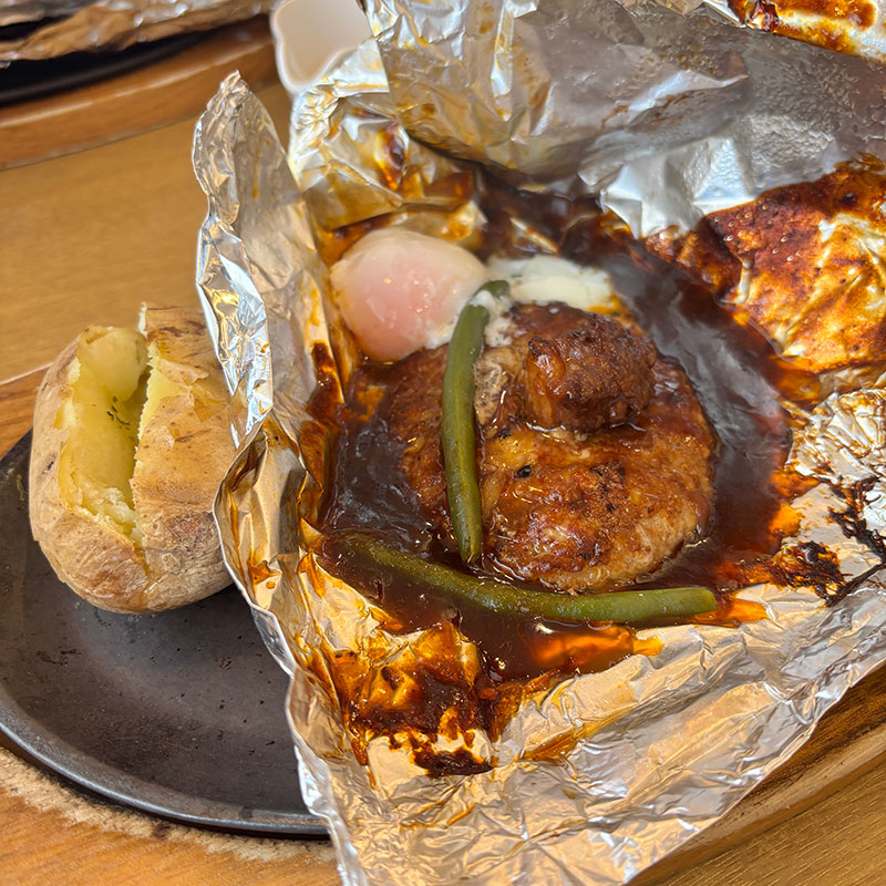 ついでにランチも。包み焼きハンバーグ温泉玉子付き。