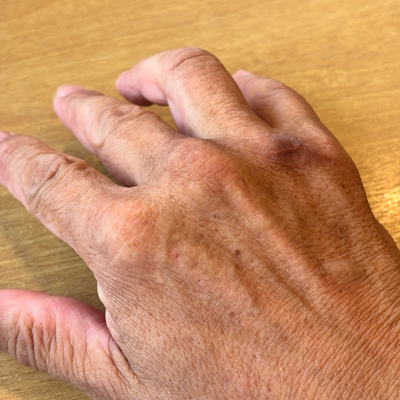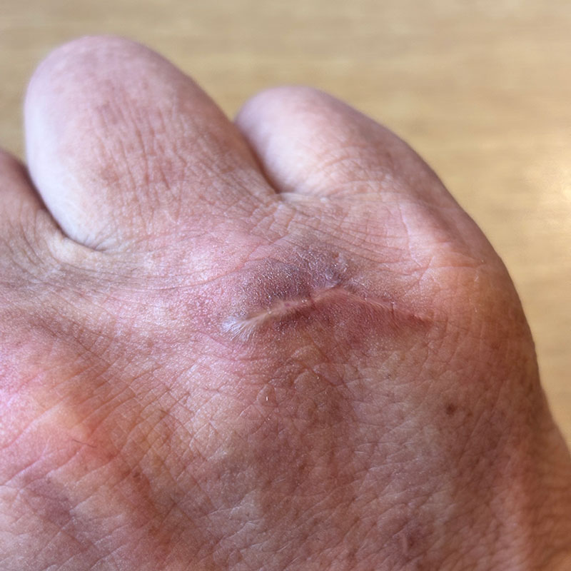 中指の下から小指の下まで甲の皮膚を裂いてしまってどうなるかと思った。右手だったし。