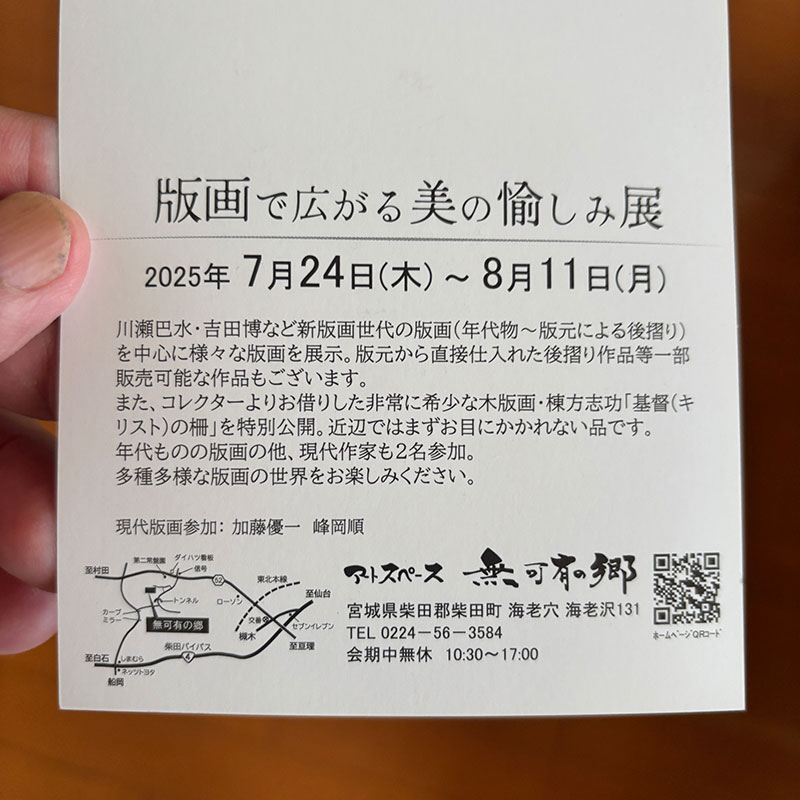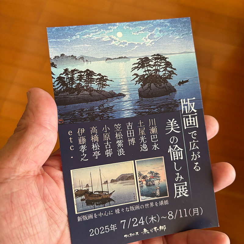 アートスペース無可有の郷で「版画で広がる美の愉しみ展」を見た。川瀬巴水を始め近代の版画作品がたくさん飾られてた。ほとんどが自然や建物の風景。花鳥風月。その色彩の鮮やかなこと。面の色彩の強さと重なる色の繊細さ。木に彫られた細い輪郭線。うっとり。すごく充実した展示で堪能した。