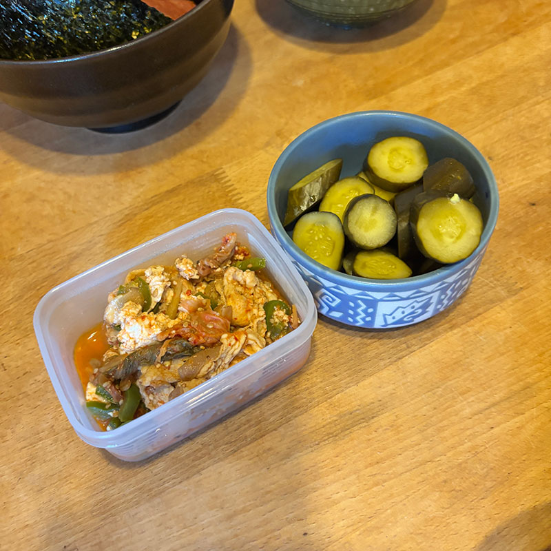 キムチと豚肉炒めとぬか漬け。