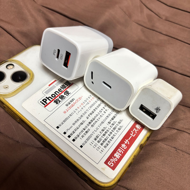 ACアダプタの挿し口もUSBとType-Cがあって旅行の時、組み合わせを間違えると充電出来なくなって困ったりする。iPhoneは7,13,15の3台使いだしカミさんはAndroid。他にコンデジやスマホスタンド、スピーカーなど充電が必要な機器がたくさんあるのでこれ一本でいろんなパターンに対応できると便利。