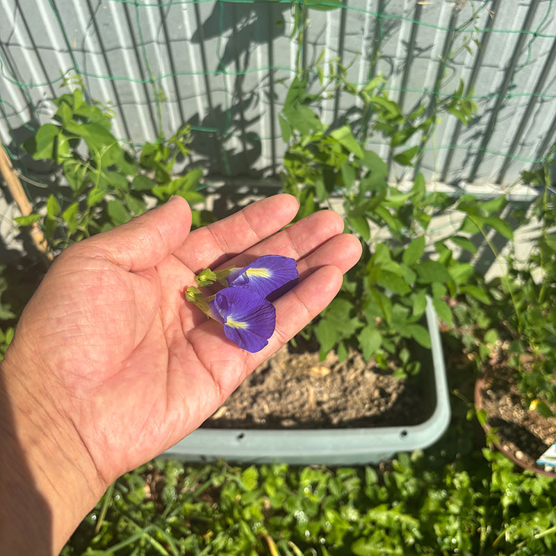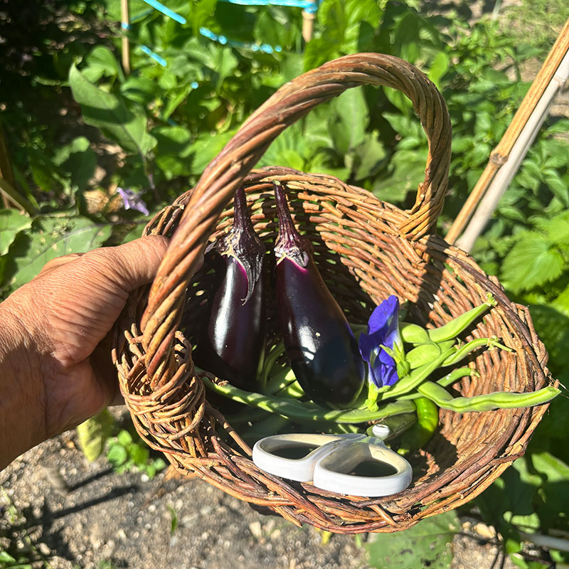 今朝の収穫は茄子、いんげん豆、オクラ、