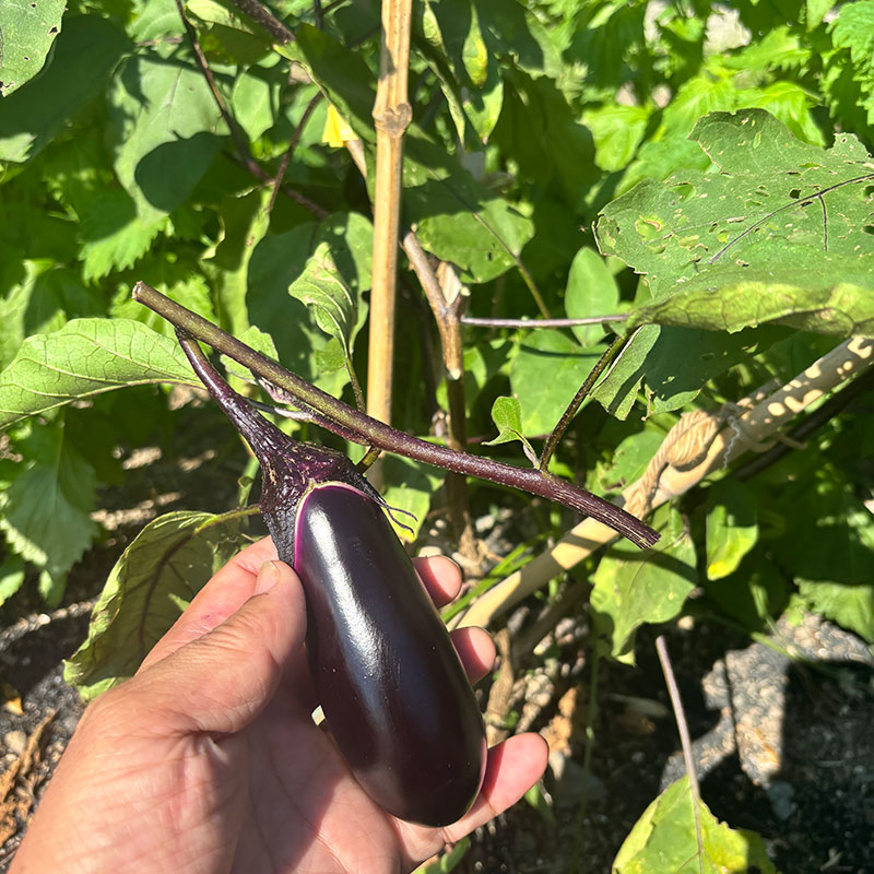 側枝に実った茄子は剪定を兼ねて枝ごとカットして収穫。