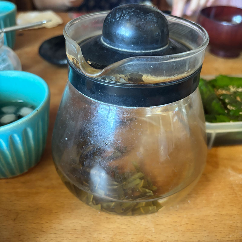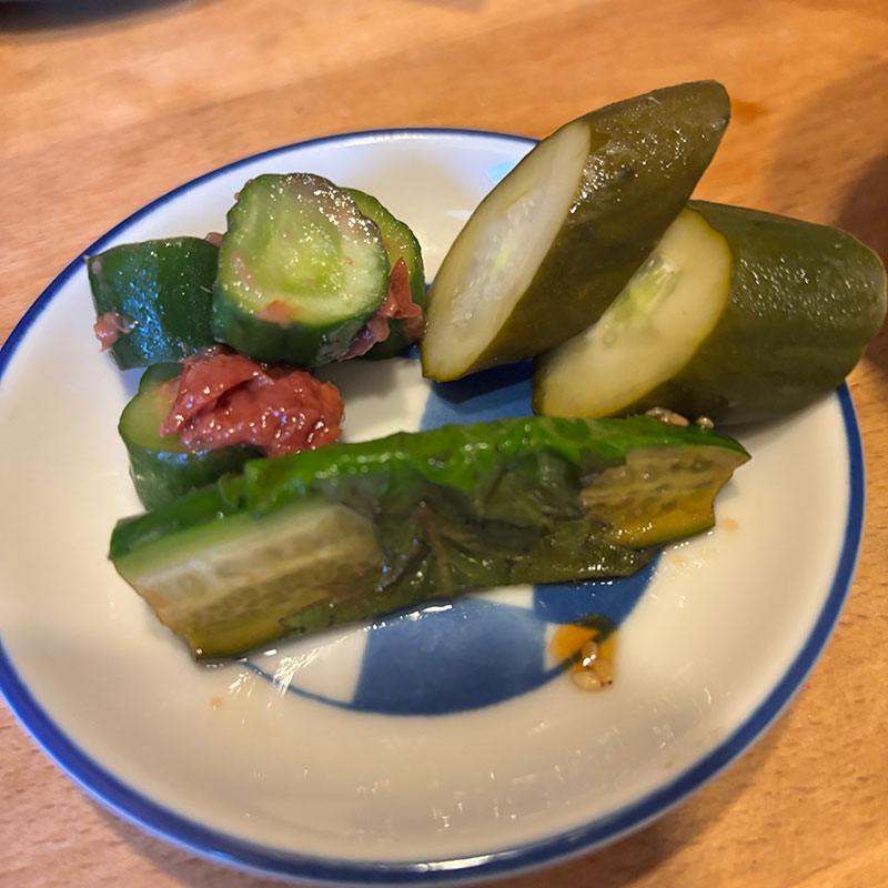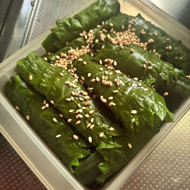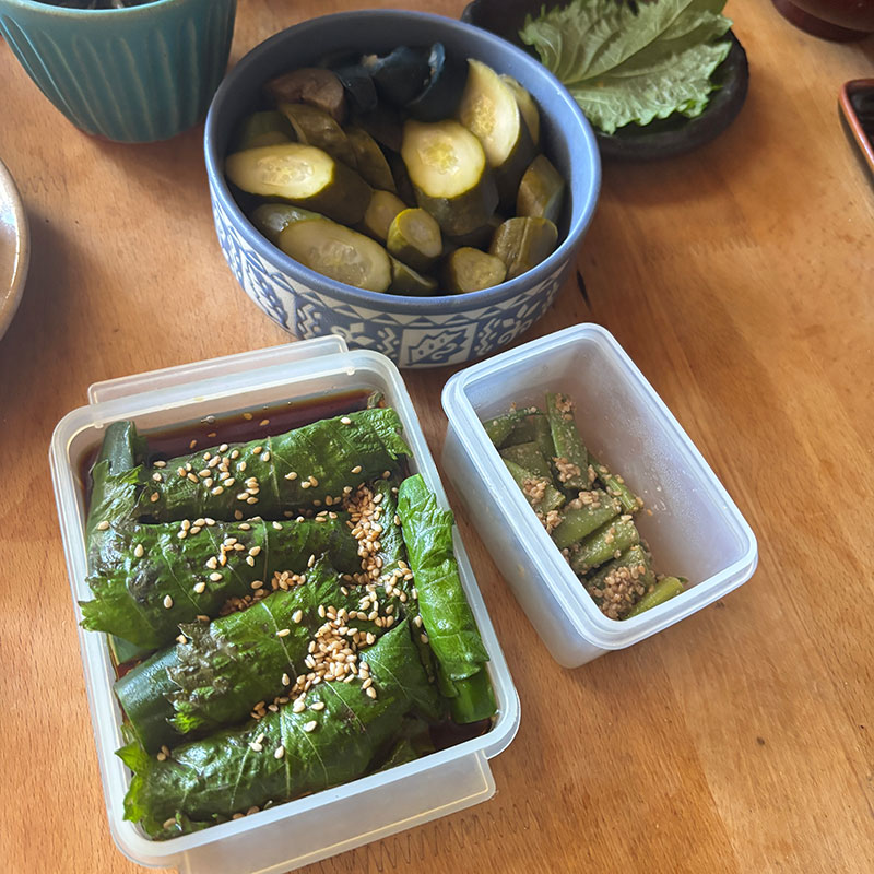 ぬか漬け、叩き梅和え、大葉で巻いてタレに漬け込んだもの。