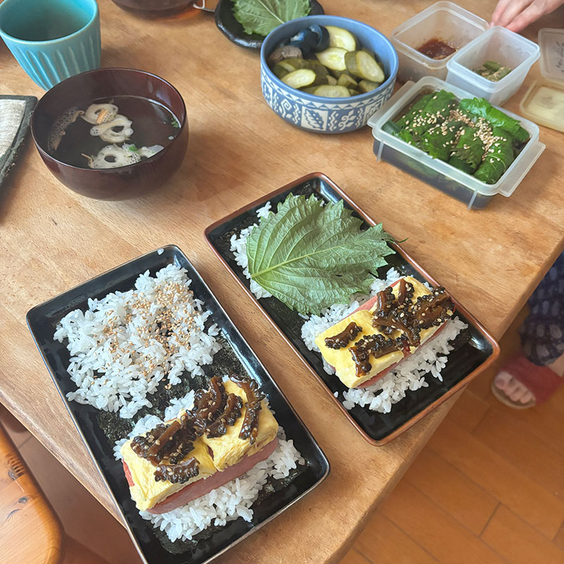 卵焼きとポークランチョンミートにゴーヤの佃煮。カミさんは畑の大葉もトッピング。