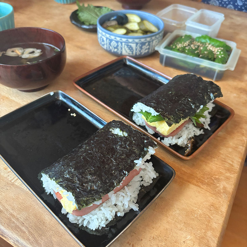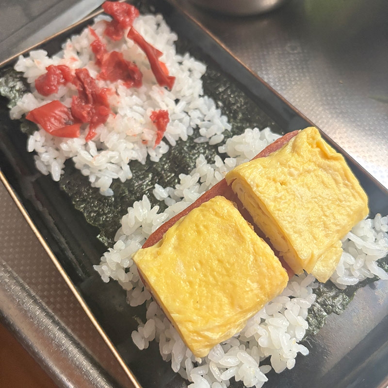 昨日に続いて今日もポークたまごおにぎりの昼飯。
