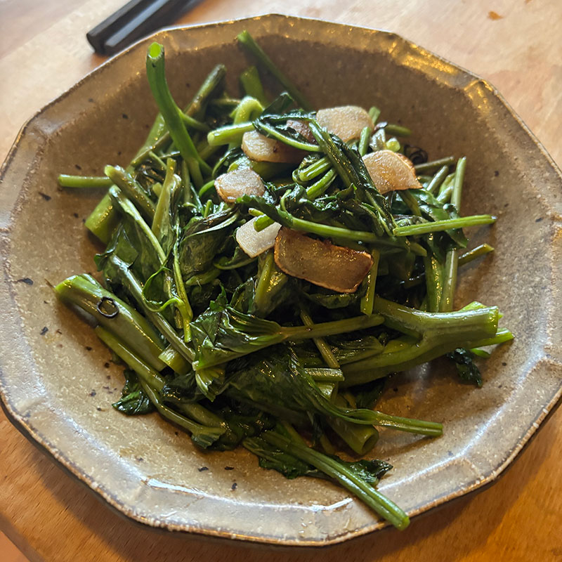 空芯菜の炒め。中華の炒め物の中でも特に好き。畑でも育ててるけど虫にやられて何度も撒き直して数株がやっと摘心する30cmくらいまでになった。