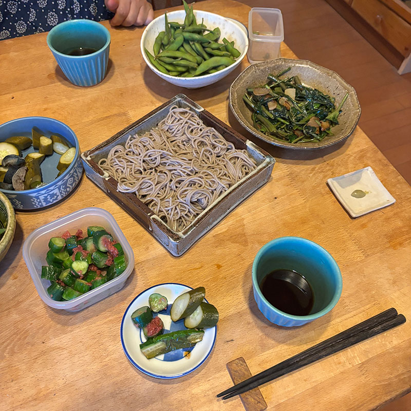 畑で豊作のいんげん豆の胡麻和えと大葉で巻いてタレに漬けたきゅうり。きゅうりと茄子のぬか漬け。