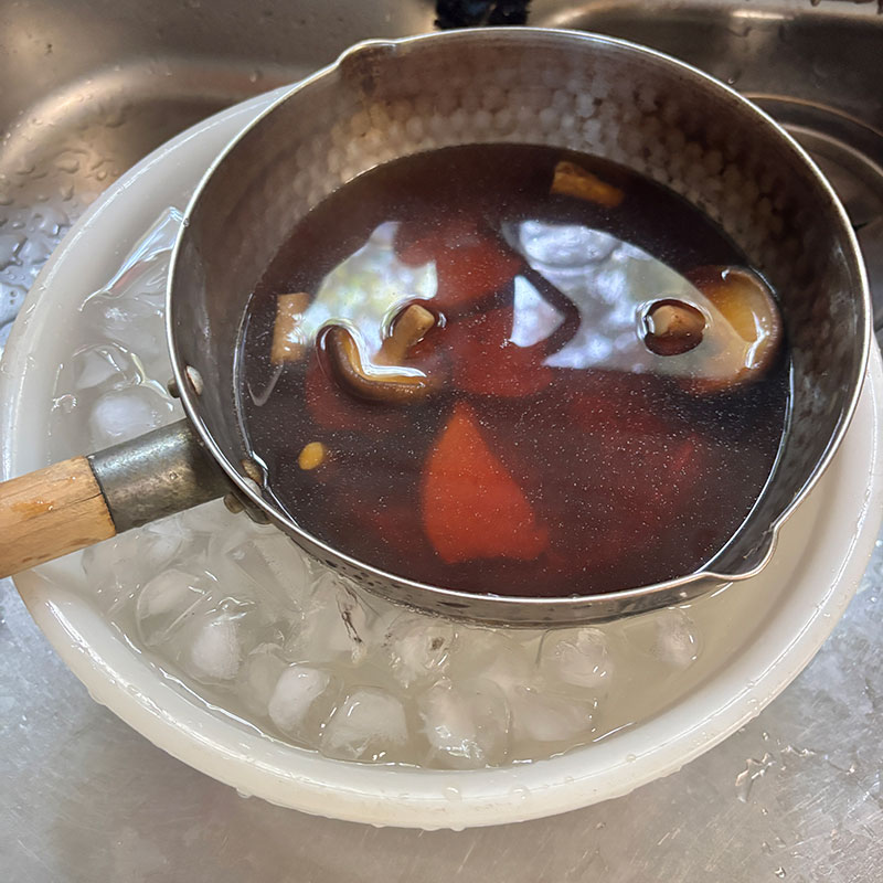 昆布水を昆布ごと、椎茸、鰹節パックを揉んで粉々にしてていねいに出汁をとった。鰹節は漉さずにそのまま。みりんで少し甘めに