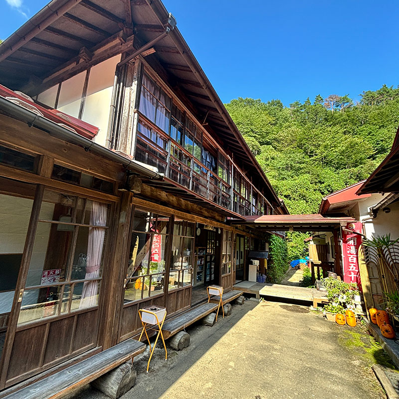 開湯150年ののぼりあり。無色透明、匂いもないさらりとした温泉。
