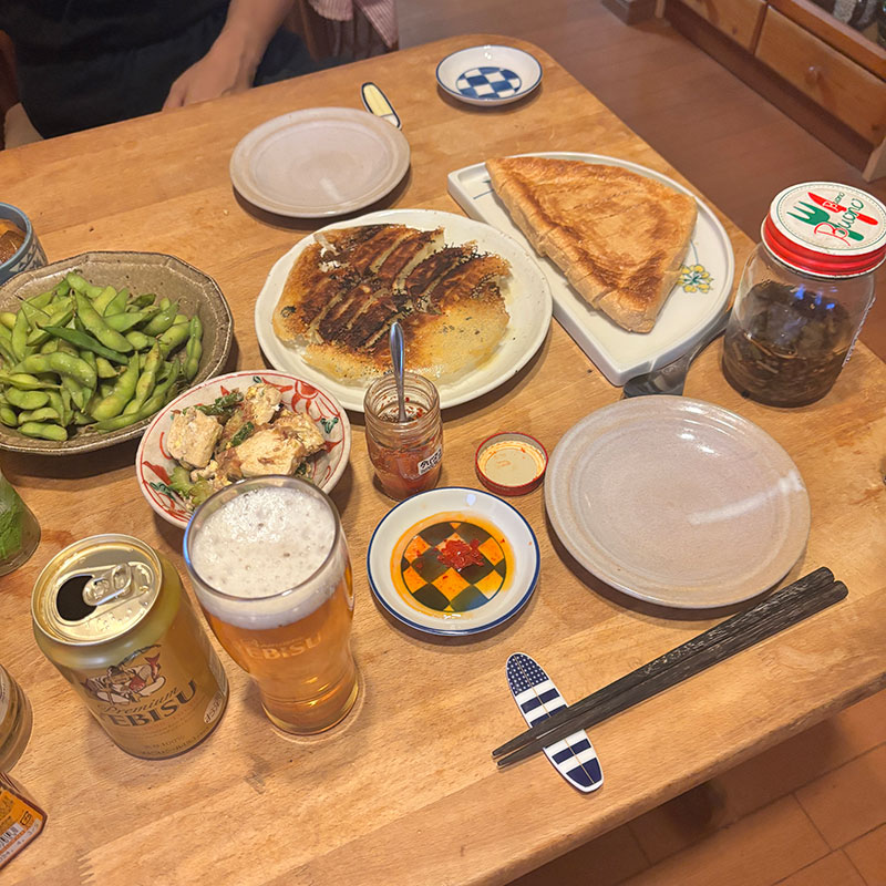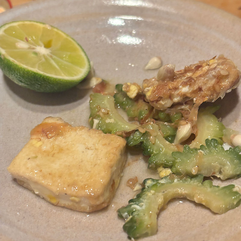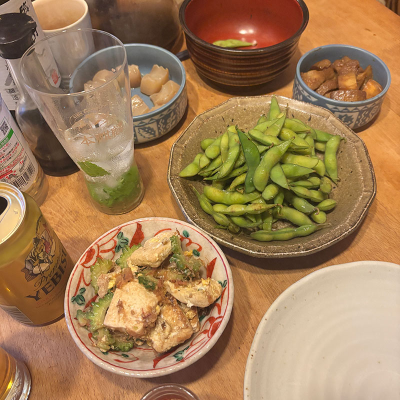 買ってきた枝豆と昨日の残りのゴーヤチャンプルー。