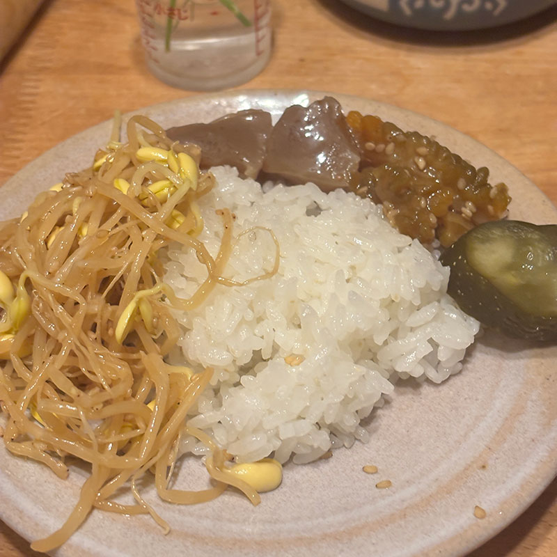 豆もやしのナムル、こんにゃくの煮物、ゴーヤの佃煮、きゅうりのぬか漬け。