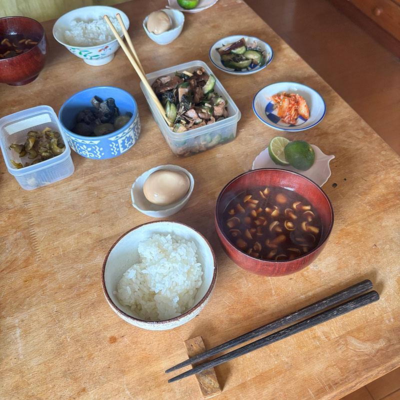 畑の赤紫蘇や茄子、ミョウガなどで漬けたしば漬けが
