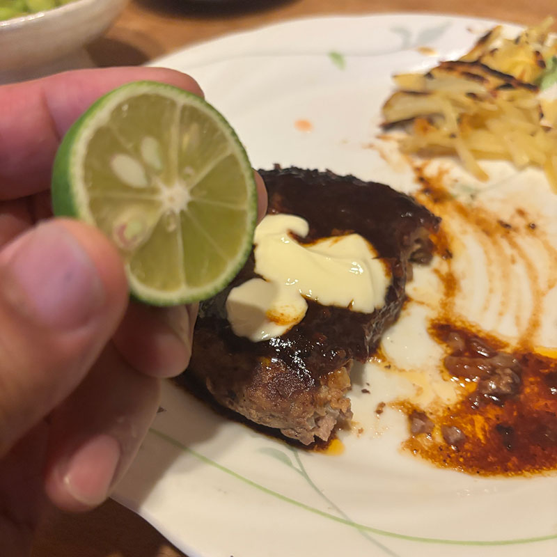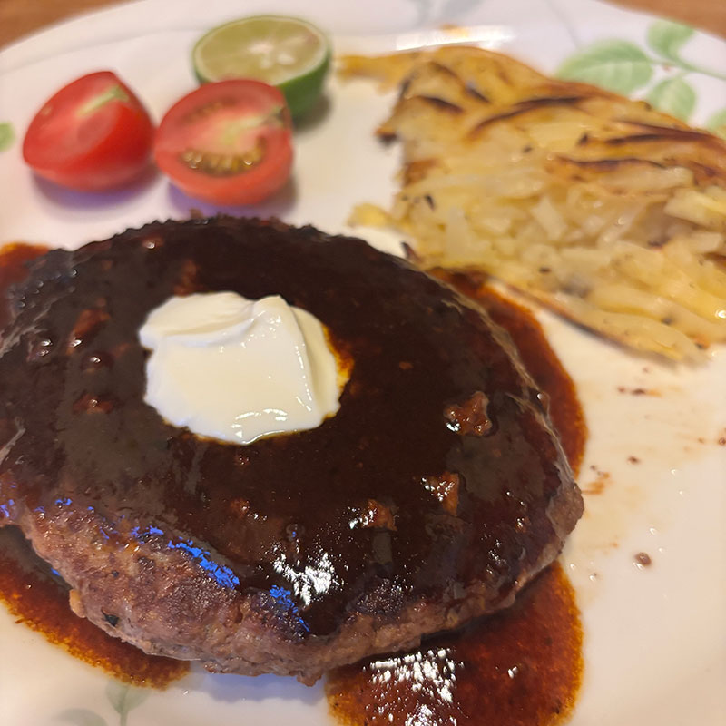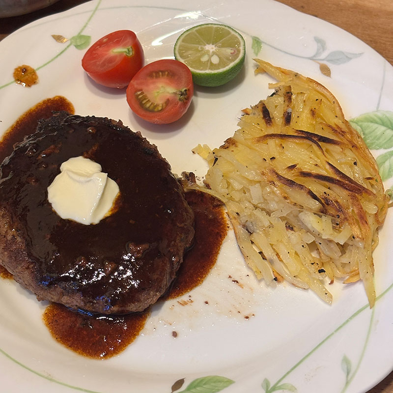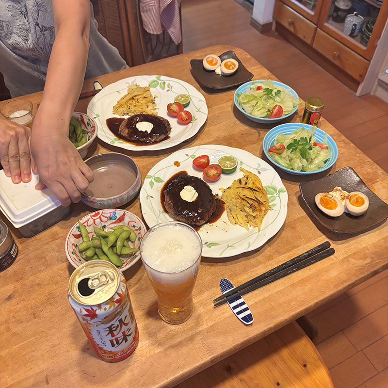 居酒屋我家、開店。カミさんがハンバーグ焼いてくれた。