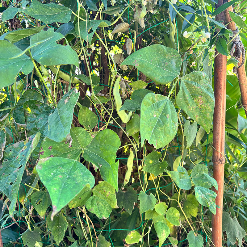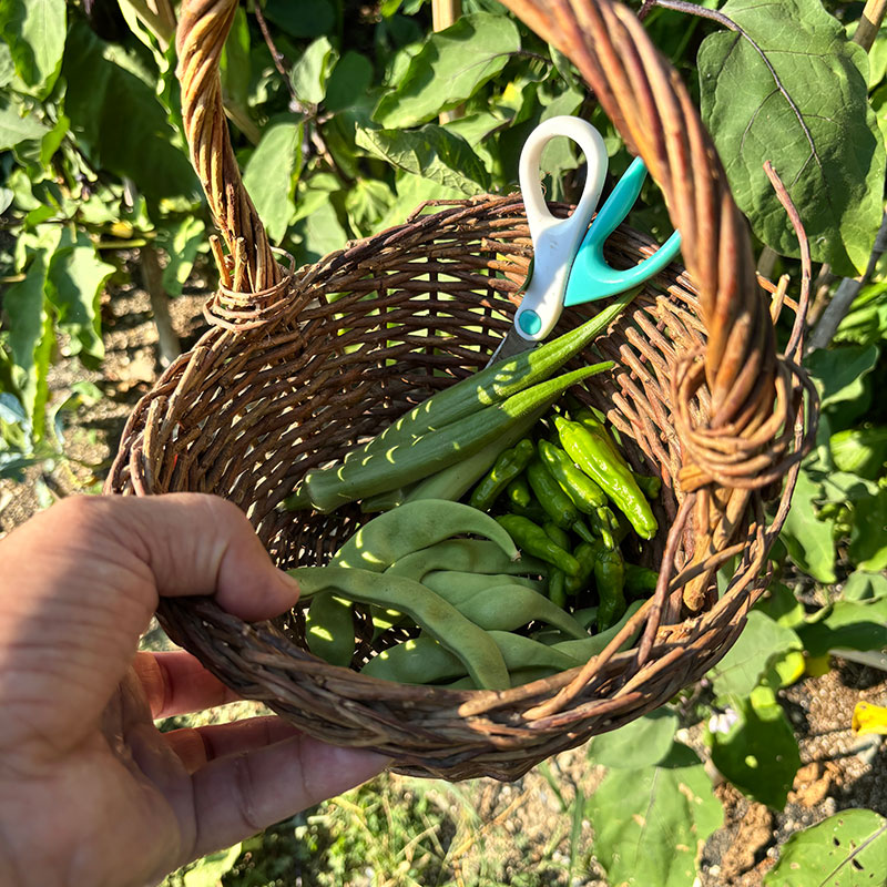 今朝の収穫はオクラ、モロッコいんげん、ししとう。みどりばかり。