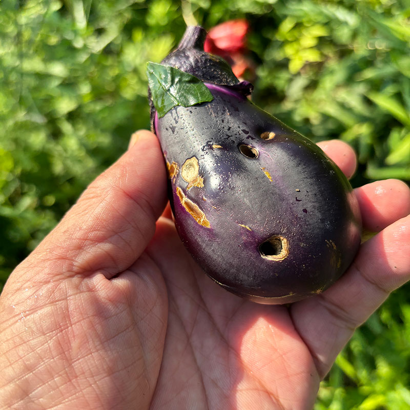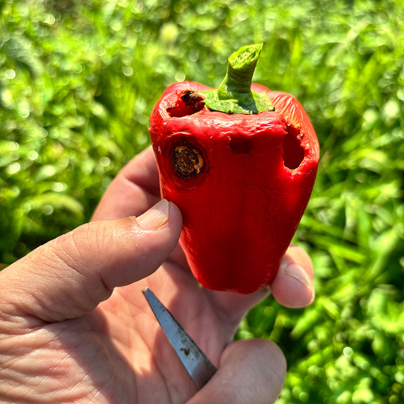 ふたつなっていたパプリカは虫に食われた。がっかり。おととい収穫してしまえばよかった。
