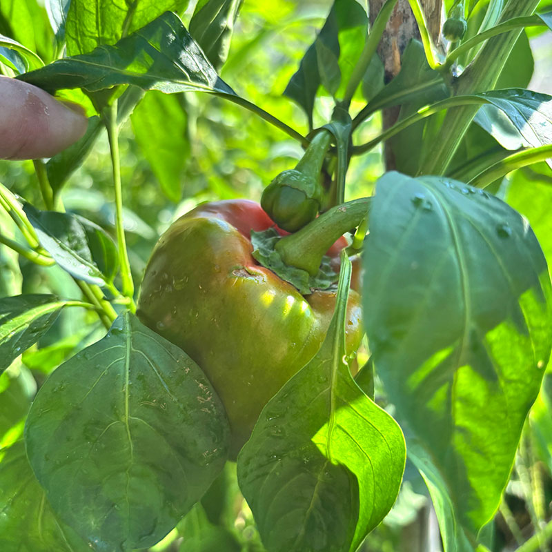 パプリカはまだ青いのがひとつだけ残っている。赤くなったらすぐ収穫しよう。