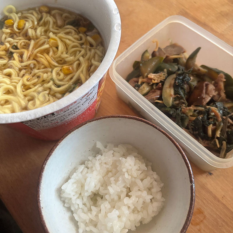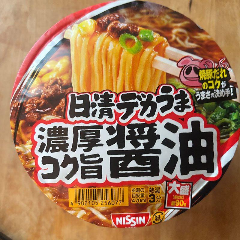 ラーメンライスの昼飯。日清デカうま 濃厚コク旨醤油と